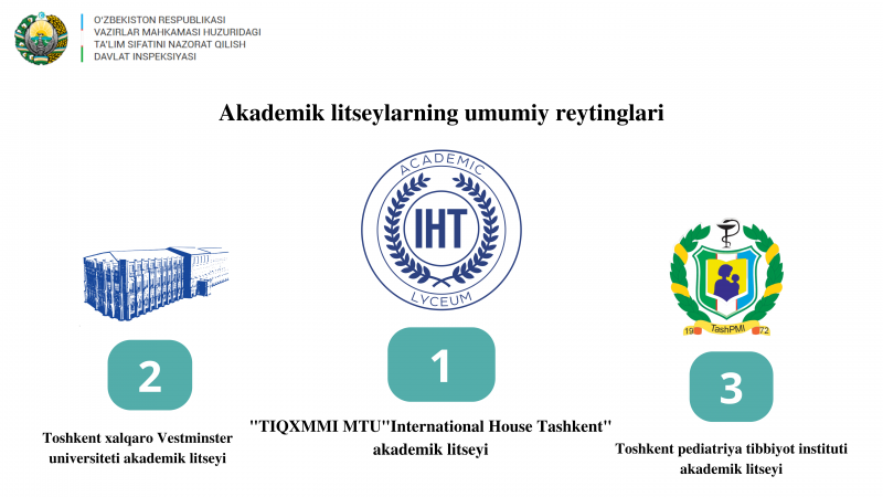 Bugun O‘zbekiston Respublikasi Vazirlar Mahkamasi huzuridagi Ta’lim sifatini nazorat qilish davlat inspektsiyasi oliy taʼlim muassasalari milliy reytingi hamda O’zbekistonda ilk marotaba aniqlangan akademik litseylar reytingini eʼlon qildi.