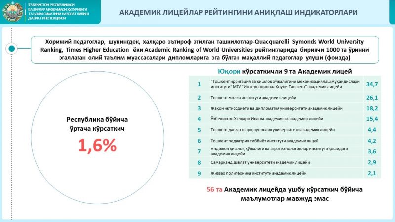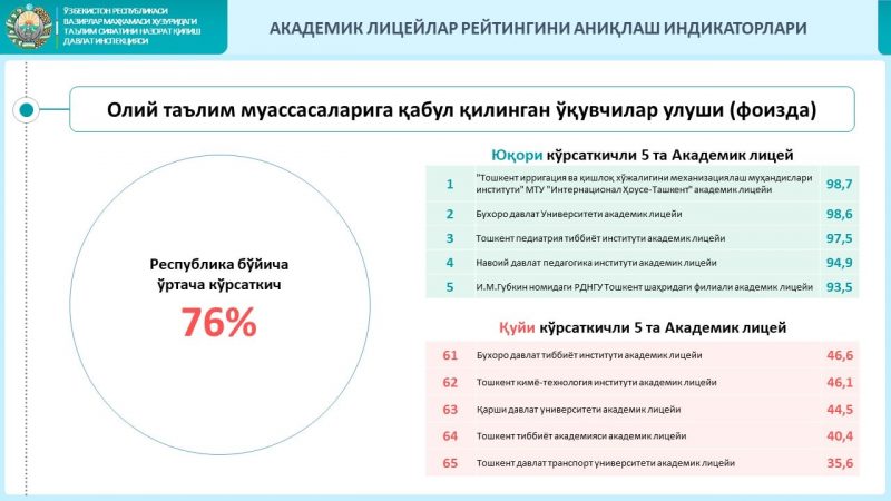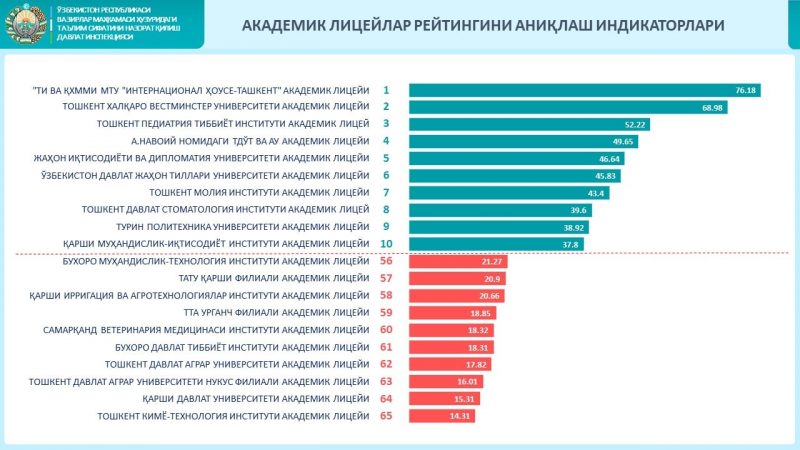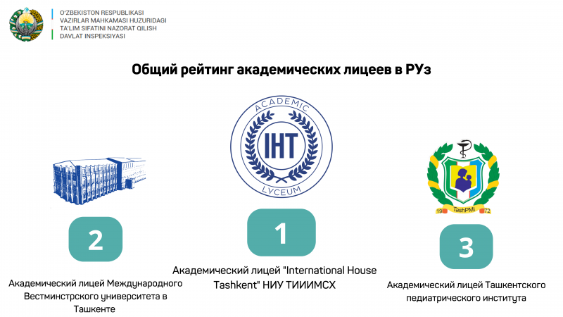 Сегодня Государственная инспекция по контролю качества образования при Кабинете министров Республики Узбекистан опубликовала Национальный рейтинг высших учебных заведений, а также Рейтинг академических лицеев, впервые выявленных в Узбекистане.